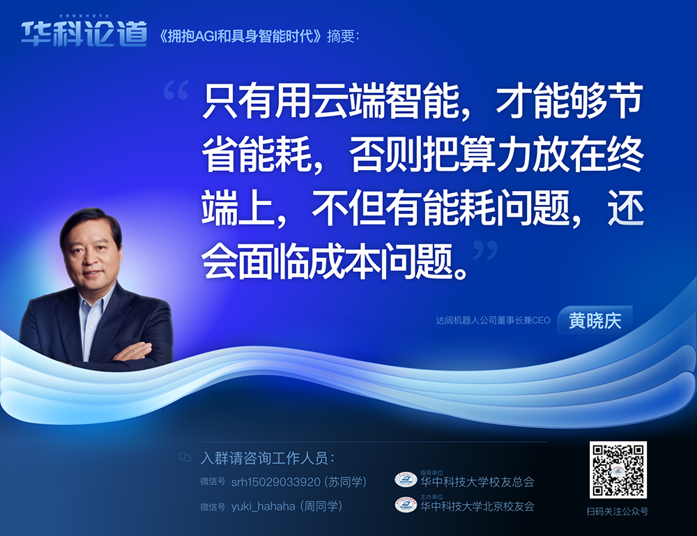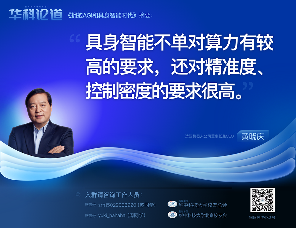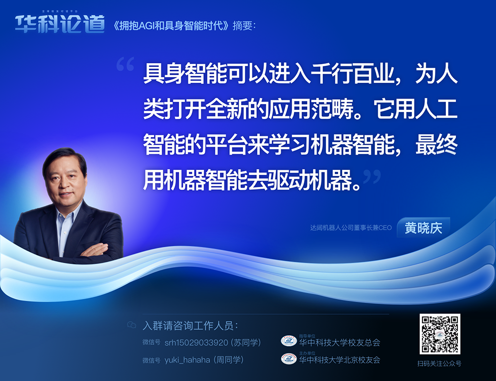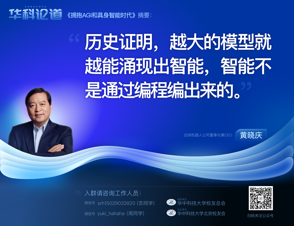 1月30日,在第五十五期「華科論道」上,由華中科技大學北京校友會主辦的活動迎來了一位特別嘉賓——達闥機器人公司董事長兼CEO黃曉慶先生,他帶來了「擁抱AGI和具身智能時代」的主題演講,為廣大校友帶來了精彩紛呈的分享。